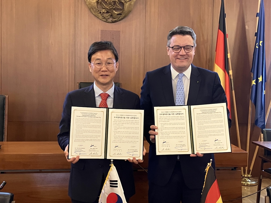 | ▲ 안산시-독일 아헨특구시, 신재생에너지분야 협력 실행협의서 체결 (안산=연합뉴스) 경기 안산시가 독일 최대 연구기관·기업 집적지인 노르트라인베스트팔렌(NRW) 주 아헨특구시와 수소 등 신재생 에너지 분야에서 협력하기로 했다. 기업유치 등을 위해 독일을 방문 중인 이민근 경기 안산시장(왼쪽)은 18일 아헨특구시청에서 팀 그뤼테아이어 아헨특구시장과 수소분야 우호협력증진을 위한 실행협의서를 체결했다. 2023.04.19 [안산시 제공. 재판매 및 DB 금지] hedgehog@yna.co.kr |