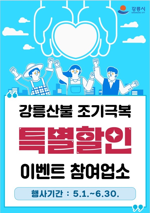 25일 강릉시에 따르면 산불 발생에 따른 지역 경기 침체를 조기에 극복하고, 관광 정상화를 도모하기 위해 5월 1일부터 6월 30일까지 지역 숙박업과 음식업이 자발적으로 참여하는 특별할인 이벤트를 진행한다.
