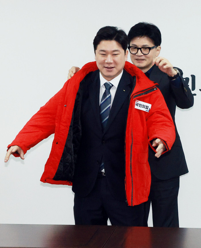 Four-time Olympic pistol shooting champion Jin Jong-oh (front) has a jacket of the ruling People Power Party put on by Han Dong-hoon, the party's interim leader, during a ceremony to mark Jin's joining the party at its headquarters in Seoul on Feb. 5, 2024. (Yonhap)