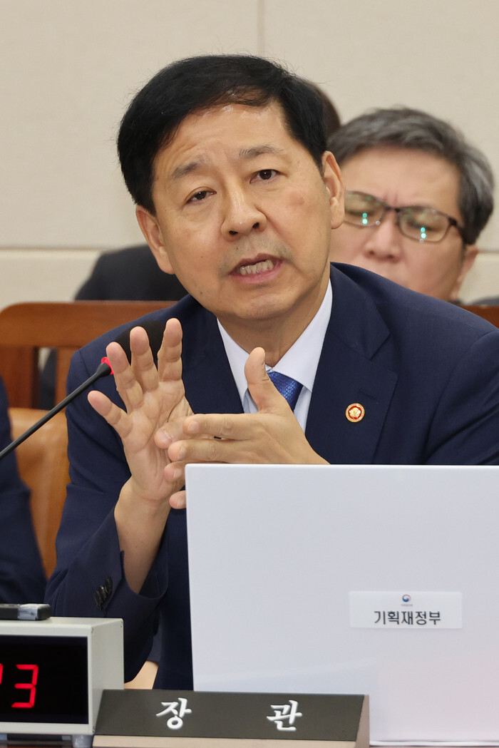 Finance Minister Koo Yun-cheol, who doubles as the deputy prime minister for economic affairs, speaks during a plenary session of the strategy and finance committee at the National Assembly in Seoul on Aug. 6, 2025. (Yonhap)