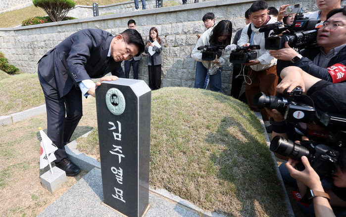 Kim Moon-soo, the candidate of the People Power Party for the June 3 presidential election, visits the tomb of Kim Ju-yeol, a late democratic fighter, at the March 15 National Cemetery in the southeastern coastal city of Changwon on May 28, 2025, to pay tribute to democratic fighters killed in a 1960 pro-democracy demonstration in the city that added fuel to mounting public protests against the dictatorial regime of then President Rhee Syng-man. A nationwide protest took place on April 19, 1960, forcing the president to step down. (Yonhap)