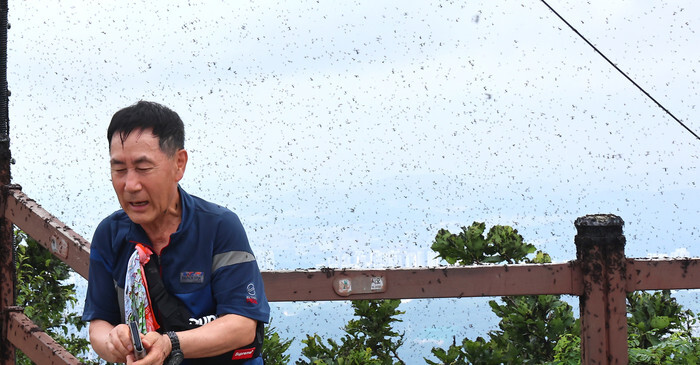 A mountaineer tries to avoid a swarm of lovebugs on the summit of Mount Gyeyang in Incheon, west of Seoul, on June 30, 2025, amid a surge in complaints about the insect's appearance in the capital area. Lovebugs, a species of march fly, are named for their habit of staying in pairs during and after mating, even while flying. (Yonhap)