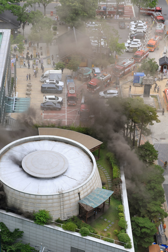 Black smoke billows from the Central Buddhist Museum, affiliated with the Jogye Order, South Korea's largest Buddhist sect, in Seoul on June 10, 2025, after it was hit by a fire. (Yonhap)