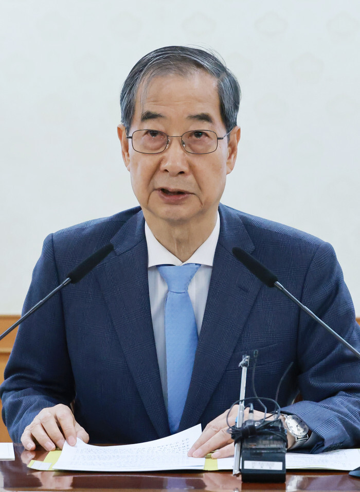 Acting President and Prime Minister Han Duck-soo attends a meeting of the task force for strategies of economic security at the government complex in Seoul on April 21, 2025. (Yonhap)