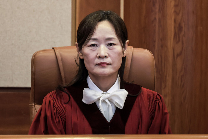 Jung Jung-mi, a justice of the Constitutional Court, is seated at the courtroom in Seoul on March 27, 2025, to attend a verdict hearing on the constitutionality of a case. (Pool photo) (Yonhap)
