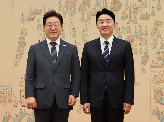 President Lee Jae Myung (L) poses for a photo with presidential chief of staff Kang Hoon-sik after presenting him with a letter of appointment at the presidential office in Seoul on July 4, 2025. (Pool photo) (Yonhap)