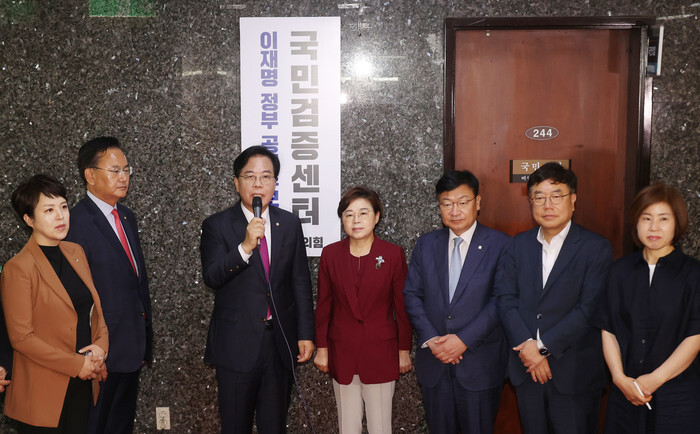 Song Eon-seog (3rd from L), interim leader of the main opposition People Power Party, speaks during a ceremony at the National Assembly in Seoul on July 8, 2025, to unveil a plaque displaying the Korean name of a national center for vetting candidates of the Lee Jae Myung government's public office holders. (Pool photo) (Yonhap)