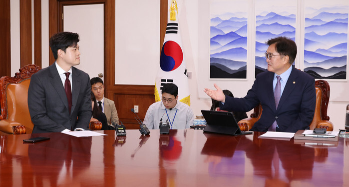 National Assembly Speaker Woo Won-shik (R) talks with Kim Yong-tae, leader of the conservative People Power Party's emergency leadership committee, during their meeting at the parliament building in Seoul on May 19, 2025. (Yonhap)