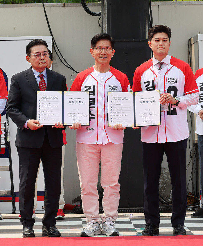 Kim Moon-soo (C), the candidate of the People Power Party for the June 3 presidential election, and the party's interim leader Kim Yong-tae (R) pose for a photo with Jun Byung-hun, head of the minor New Future Democratic Party, after forming a pact on a policy alliance between the parties during a campaign stop in Gapyeong, east of Seoul, on May 30, 2025. (Yonhap)