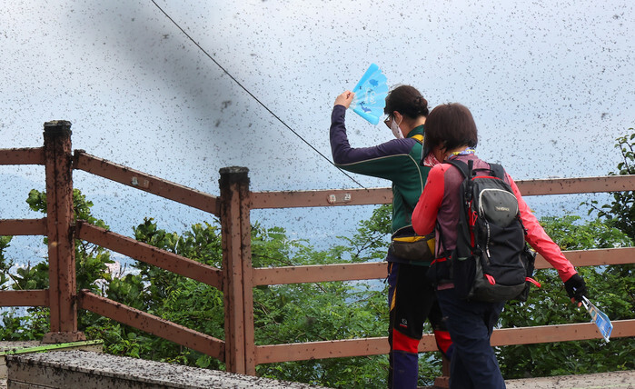 Mountaineers try to avoid a swarm of lovebugs on the summit of Mount Gyeyang in Incheon, west of Seoul, on June 30, 2025, amid a surge in complaints about the insect's appearance in the capital area. Lovebugs, a species of march fly, are named for their habit of staying in pairs during and after mating, even while flying. (Yonhap)