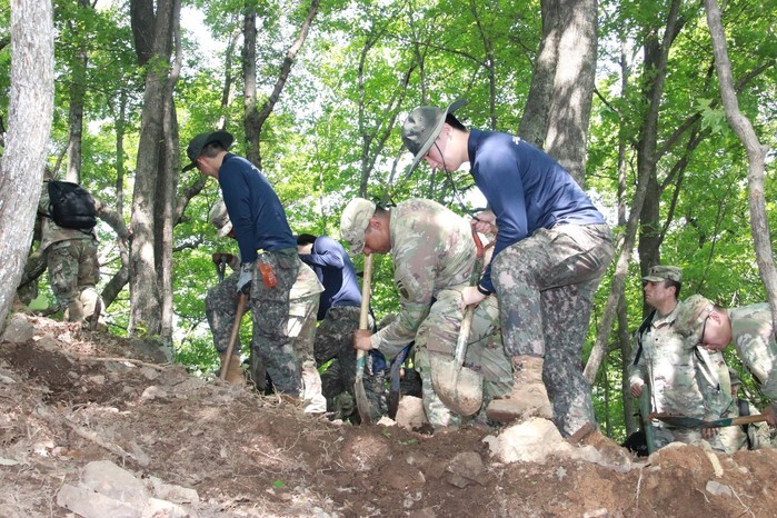 South Korean and U.S. soldiers participate in a joint operation to excavate the remains of soldiers who died during the Korean War on a mountain in Gapyeong, east of Seoul, on May 22, 2025, in this photo released the following day by the Army's Capital Mechanized Infantry Division. (PHOTO NOT FOR SALE) (Yonhap)