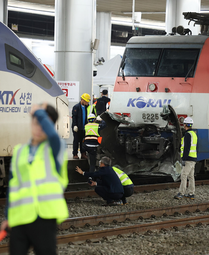 Railway workers inspect damage caused by a minor collision between trains at Seoul Station in the capital on April 18, 2024. (Yonhap)