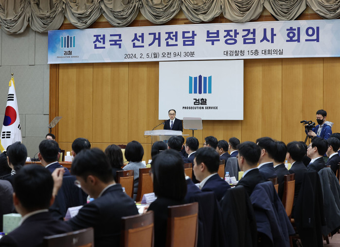 Prosecutor General Lee One-seok (C, rear) speaks during a meeting of senior prosecutors from across the country at the Supreme Prosecutors Office in Seoul on Feb. 5, 2024, to call for the fair management of the upcoming April 10 parliamentary elections. (Yonhap)