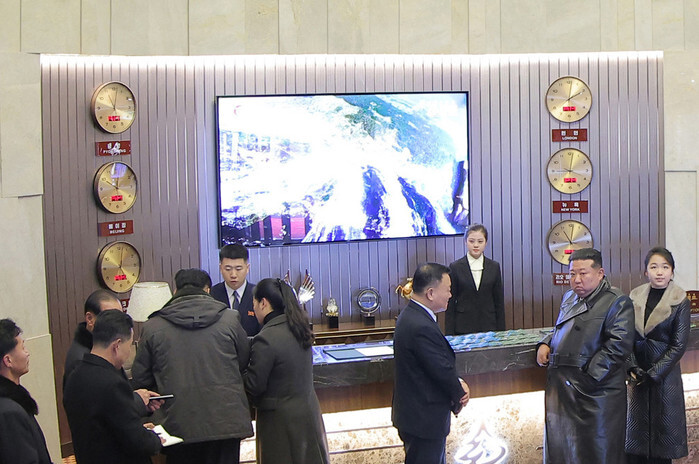 North Korean leader Kim Jong-un (2nd from R), alongside his daughter, Ju-ae (far R), stands at the front desk of Ikkal Hotel, which has clocks for Pyongyang, Beijing, Moscow, London, New York and Rio de Janeiro, during a ceremony marking the completion of the hotel in Samjiyon at the foot of Mount Paektu in northern North Korea on Dec. 20, 2025, in this photo released by the North's official Korean Central News Agency on Dec. 23. Kim took part in the dedication of the Ikkal and Milyong hotels, two of the five new modern hotels in the mountainous city, which also include the Sobaeksu, Ponnamu and Chongbong hotels. (For Use Only in the Republic of Korea. No Redistribution) (Yonhap)