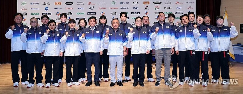 | ▲ '파리올림픽 D-30' 팀코리아 파이팅! (진천=연합뉴스) 김인철 기자 = 26일 충북 진천국가대표선수촌 챔피언하우스에서 열린 2024 파리하계올림픽 D-30 미디어데이 대한민국 선수단 기자회견에서 이기흥 대한체육회장과 국가대표 감독, 선수들이 기념촬영을 하고 있다. 2024.6.26 yatoya@yna.co.kr |