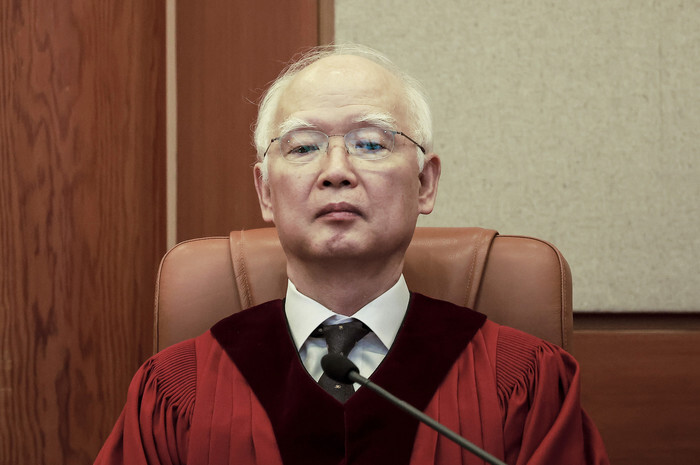 Cheong Hyung-sik, a justice of the Constitutional Court, is seated at the courtroom in Seoul on March 27, 2025, to attend a verdict hearing on the constitutionality of a case. (Pool photo) (Yonhap)