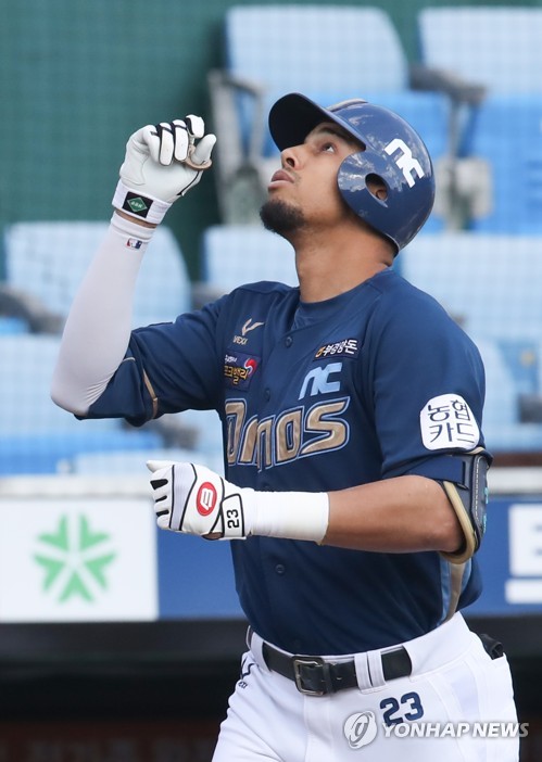 | ▲ In this file photo from Sept. 27, 2020, Aaron Altherr of the NC Dinos celebrates solo home run against the Hanwha Eagles in the top of the second inning of a Korea Baseball Organization regular season game a Hanwha Life Eagles Park in Daejeon, 160 kilometers south of Seoul. (Yonhap) |