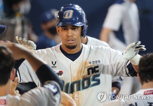 | ▲ In this file photo from Aug. 29, 2020, Aaron Altherr of the NC Dinos is greeted by teammates after hitting a two-run home run against the SK Wyverns in the bottom of the seventh inning of a Korea Baseball Organization regular season game at Changwon NC Park in Changwon, 400 kilometers southeast of Seoul. (Yonhap) |