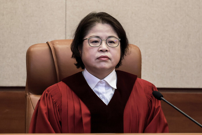 Kim Bok-hyeong, a justice of the Constitutional Court, is seated at the courtroom in Seoul on March 27, 2025, to attend a verdict hearing on the constitutionality of a case. (Pool photo) (Yonhap)