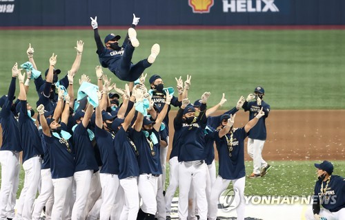 | ▲ 헹가래 받는 김택진 구단주 (서울=연합뉴스) 윤동진 기자 = 24일 서울 구로구 고척스카이돔에서 열린 2020 프로야구 포스트시즌 한국시리즈(KS) 6차전 두산 베어스와 NC 다이노스의 경기. 통합 우승을 차지한 NC 선수들이 김택진 구단주를 헹가래하고 있다. 2020.11.24 mon@yna.co.kr |