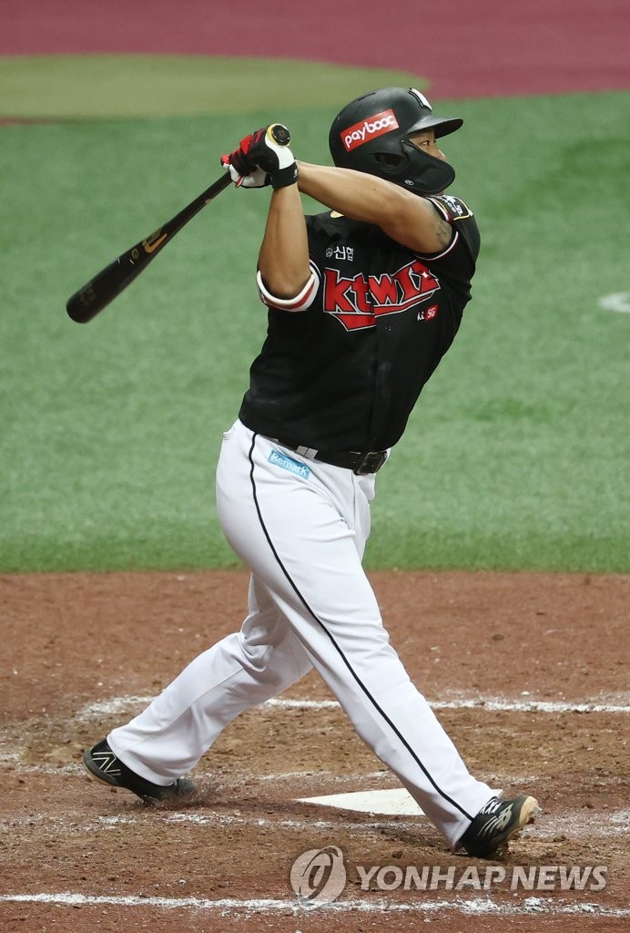 | ▲ In this file photo from Sept. 3, 2021, Kang Baek-ho of the KT Wiz hits an RBI double against the Kiwoom Heroes in the top of the eighth inning of a Korea Baseball Organization regular season game at Gocheok Sky Dome in Seoul. (Yonhap) |