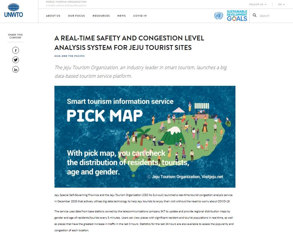 UNWTO는 제주의 '실시간 관광지혼잡도분석서비스'가 관광객에게 관광지 혼잡도 관련 정보를 빅데이터로 실시간 제공함으로써 코로나19 위기를 극복하는데 효과적인 시도라고 소개했다.
