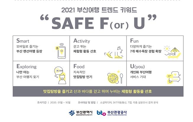 (부산=연합뉴스) 박창수 기자 = 부산관광공사는 소셜미디어, 이동통신, 설문조사 등 데이터 분석을 통해 2021년 부산 여행의 키워드로 'SAFE For U'를 선정했다고 31일 밝혔다.