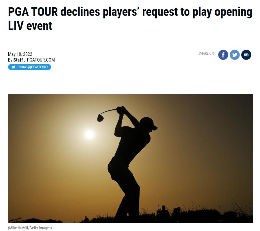 | ▲ 선수들의 리브 인터내셔널 대회 출전 요청 거부 발표한 PGA 투어 [PGA 투어 홈페이지 캡처. 재판매 및 DB 금지] |
