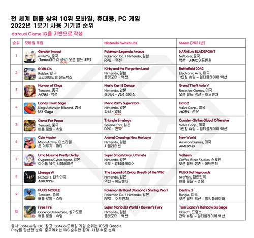 | ▲ 전 세계 매출 상위 10위 모바일·휴대용·PC 게임 [data.ai 제공. 재판매 및 DB 금지] |
