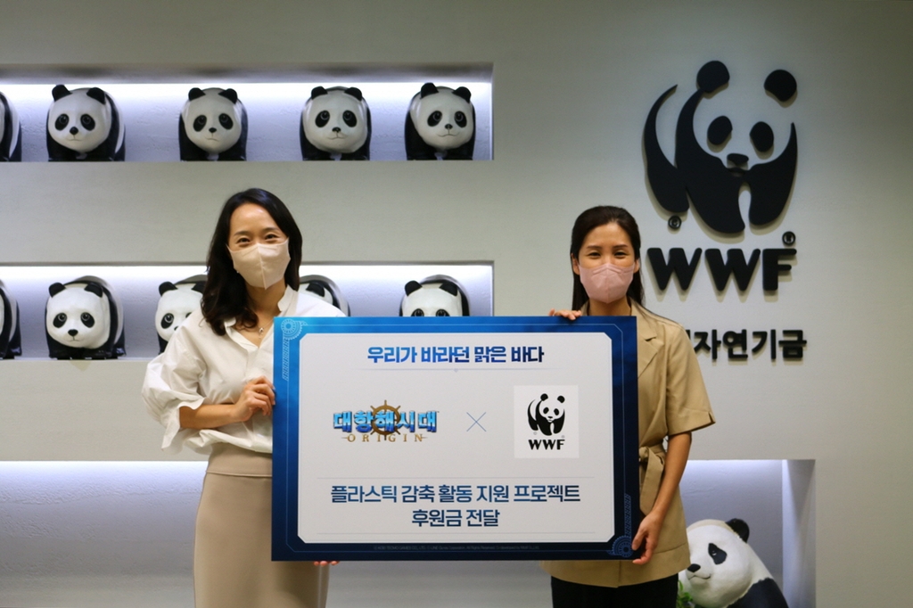▲ 라인게임즈는 지난 23일 출시한 오픈월드 다중접속역할수행게임(MMORPG) '대항해시대 오리진' 사전예약 기간인 7월 12일부터 8월 21일까지 모금한 기부금 3천만원을 세계자연기금(WWF)에 전달했다. 지난 26일 열린 기부금 전달식에는 박민혜 WWF 국장과 김미은 라인게임즈 사업실장이 참석했다. 기부금은 WWF의 플라스틱 감축 활동 지원을 위해 사용된다. (서울=연합뉴스)