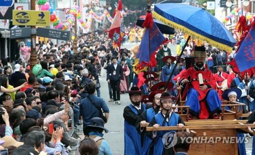 | ▲ 조선통신사 행렬 반기는 시민들 조선통신사 축제의 하이라이트인 조선통신사 행렬이 부산 중구 용두산공원에서 출발해 광복로 일대를 지나고 있다. 2018.5.5 [연합뉴스 자료사진] |