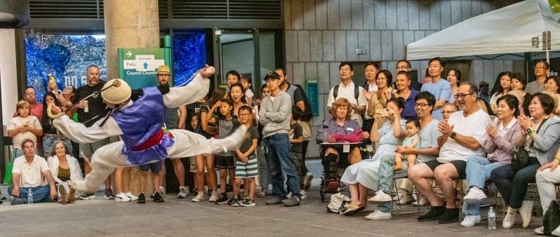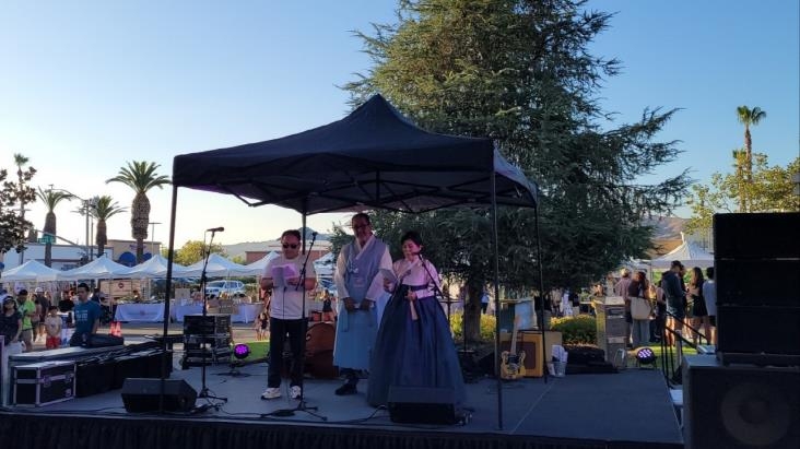 김 시장은 마티 스모노프 브레아시장과 함께 한복을 차려 입고 대회 개최 선언을 하기도 했다.