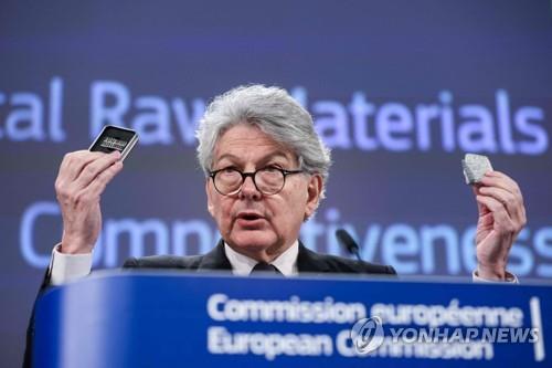 | ▲ This AFP photo shows EU commissioner for internal market Thierry Breton speaking during a press conference on the Critical Raw Materials Act in Brussels on March 16, 2023. (PHOTO NOT FOR SALE) (Yonhap) |