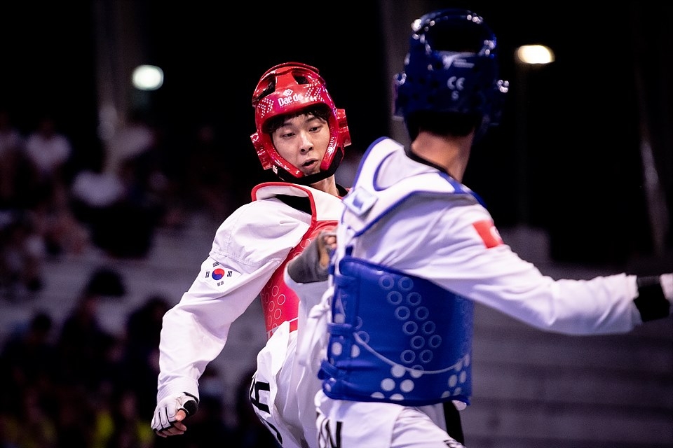 | ▲ 로마 그랑프리 남자 58㎏급 챔피언 장준(왼쪽)의 경기 모습. [세계태권도연맹 제공. 재판매 및 DB 금지] |