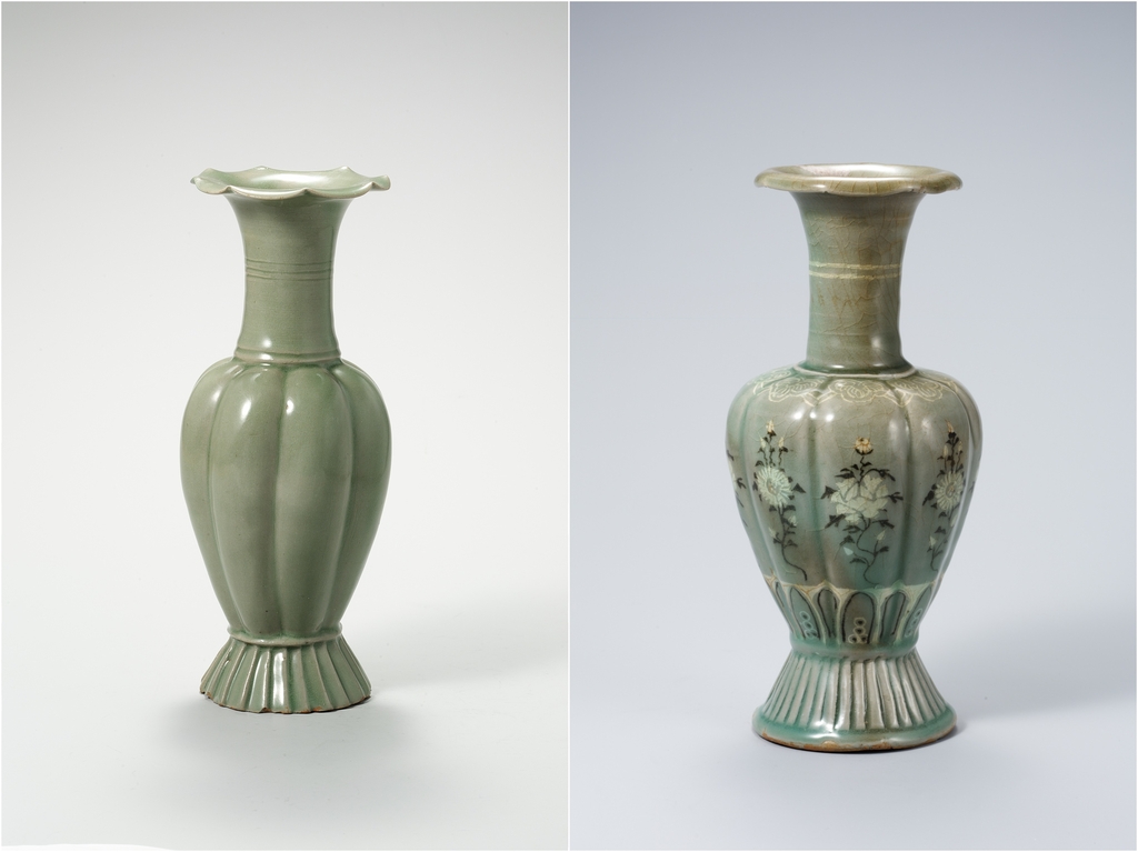 | ▲ 참외 모양 형태의 두 청자 왼쪽부터 '청자 참외 모양 병', '청자 상감 국화 모란무늬 참외 모양 병' [국립중앙박물관 제공. 재판매 및 DB 금지] |