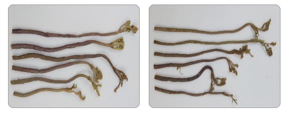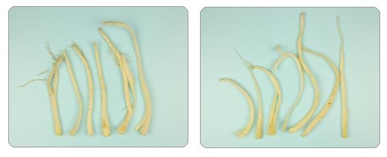 | ▲ 국산 깐도라지(왼쪽)와 중국산 깐도라지 (서울=연합뉴스) 국산은 길이가 짧고 껍질이 잘 벗겨지지 않아 일부가 남아 있다. 중국산은 길이가 상대적으로 길고 껍질이 잘 벗겨져 깨끗한 편이다. 2021.2.1 [농식품부 제공. 재판매 및 DB 금지] |