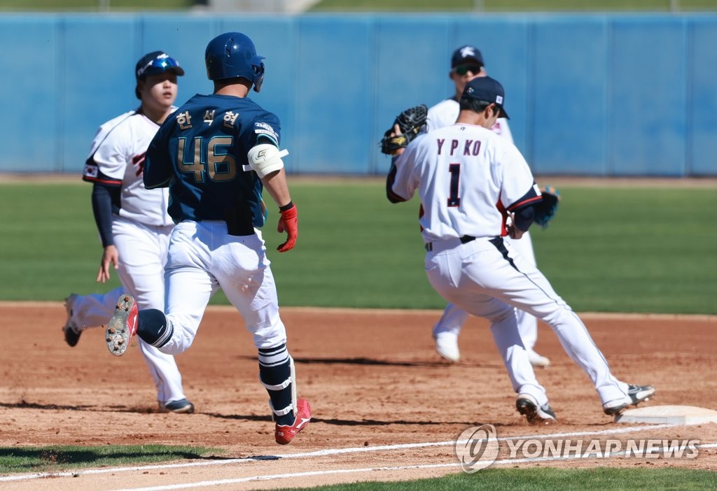 | ▲ Ko Young-pyo of South Korea (R) covers first base against the NC Dinos during a scrimmage for the World Baseball Classic at Kino Veterans Memorial Stadium in Tucson, Arizona, on Feb. 16, 2023. (Yonhap) |