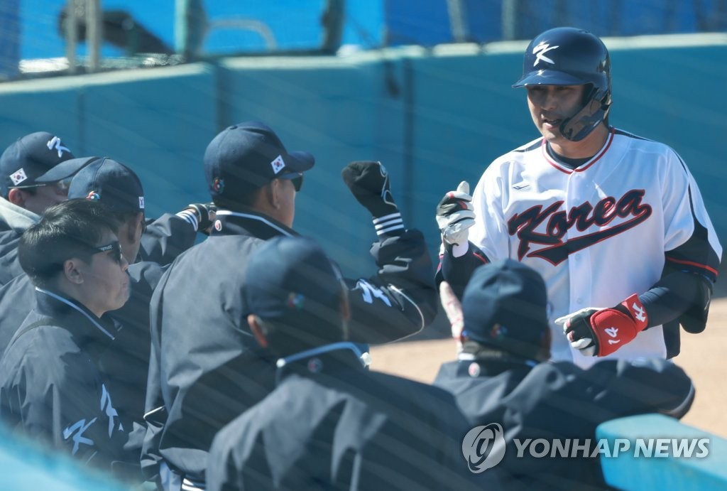 | ▲ Choi Jeong of South Korea (R) is greeted by teammates and coaches after hitting a solo home run against the NC Dinos during a scrimmage for the World Baseball Classic at Kino Veterans Memorial Stadium in Tucson, Arizona, on Feb. 16, 2023. (Yonhap) |