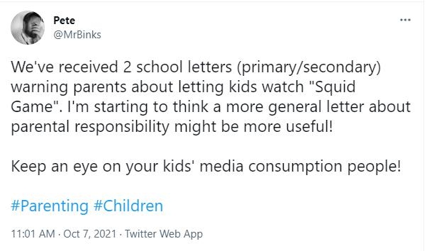 한 학부모는 소셜 미디어에 아이들이 '오징어 게임'을 보게 하는 것과 관련해서 초등학교와 중등학교에서 각각 경고 편지를 받았다고 적었다.