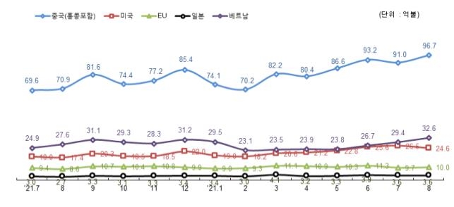 국가별로는 미국(41.7%↑), 중국(홍콩 포함, 36.3%↑), 일본(33.8%↑), 유럽연합(22.1%↑), 베트남(18.2%↑) 등으로의 수출이 늘었다.
