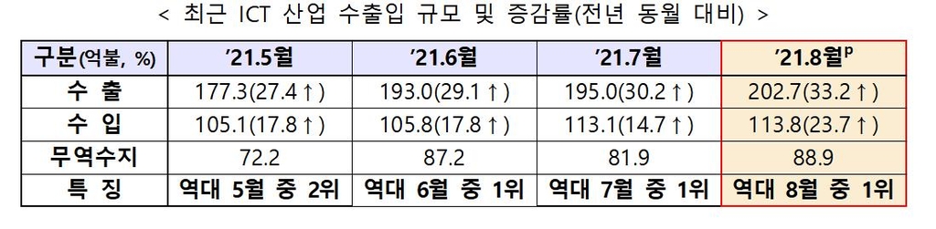 (서울=연합뉴스) 정윤주 기자 = 과학기술정보통신부는 8월 정보통신기술(ICT) 수출액이 202억7천만달러로 지난해 같은 기간보다 33.2% 증가했다고 14일 밝혔다.