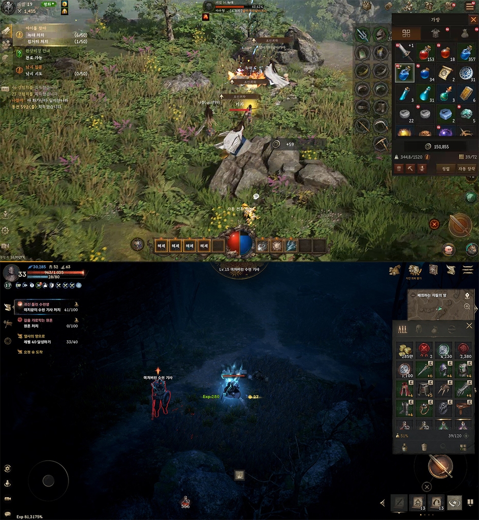 | ▲ 미르M과 리니지W(아래)의 인터페이스 비교 [미르M·리니지W 캡처] |