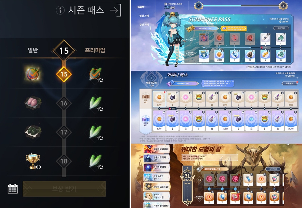 | ▲ 리니지2M의 시즌패스(왼쪽)와 서머너즈워: 크로니클의 다양한 배틀패스 [엔씨소프트 제공·서머너즈워 크로니클 캡처] |
