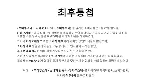 또 지난 2일에는 게임사 측에 최후통첩문을 보내 조계현 카카오게임즈 대표의 공식 사과, 관련 직원의 우마무스메 관련 업무 배제, 소비자 대표가 참가하는 간담회 개최 여부를 오는 5일까지 회신할 것을 요구했다.
