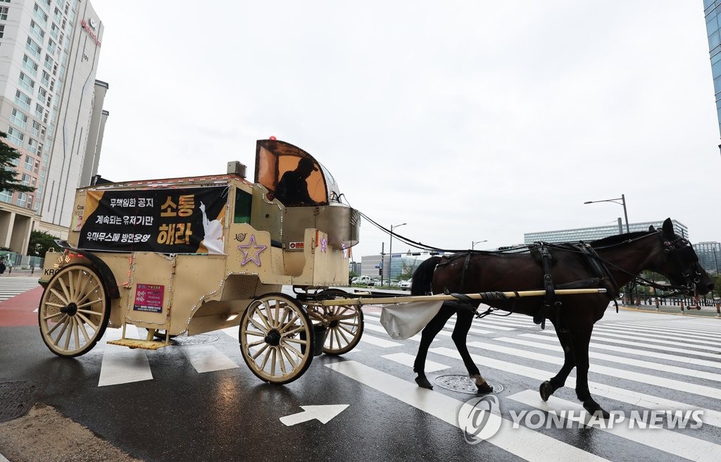 | ▲ 게이머들이 보낸 마차 카카오게임즈의 '우마무스메:프리티 더비' 국내 이용자들이 게임사 측의 운영 방침에 반발하는 항의 문구 현수막을 붙인 마차가 29일 오전 카카오게임즈 본사가 위치한 경기도 성남시 판교역 인근 도로를 달리고 있다. 2022.8.29 xanadu@yna.co.kr |