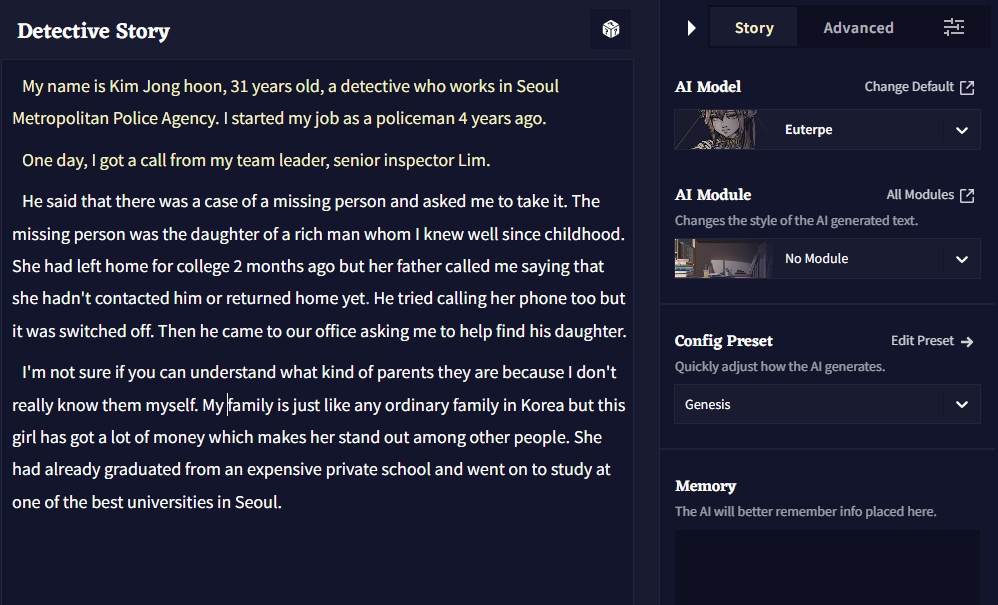 미국 기업 '아날라탄'의 인공지능(AI) 텍스트 생성 서비스 '노벨 AI'(Novel AI)가 맨 처음 입력한 문장의 문맥을 분석한 뒤, 이어지는 스토리와 대사를 즉석에서 '창작'해낸 결과물이다.