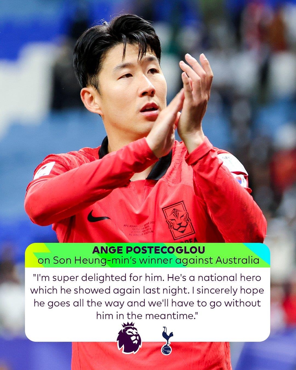 포스테코글루 감독은 "토트넘은 그동안 손흥민 없이 경기를 치러야 한다"고 아쉬워하면서도 "손흥민이 (호주와의 8강전에서) 국가적인 영웅의 모습을 보여줬다. 그의 뛰어난 활약에 정말 기쁘다"고 말했다.
