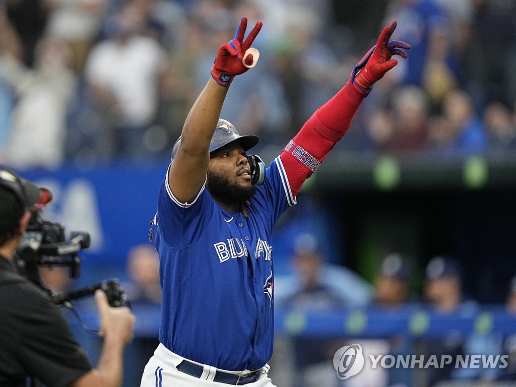 | ▲ 통산 100호 홈런을 달성한 뒤 기뻐하는 게레로 주니어 [USA TODAY Sports=연합뉴스] |
