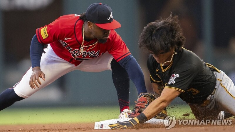 | ▲ 2루에 도달하는 배지환 (애틀랜타 AP=연합뉴스) 피츠버그 배지환이 9일(한국시간) 조지아주 애틀랜타 트루이스트파크에서 열린 2023 미국프로야구 메이저리그 애틀랜타 브레이브스와의 방문 경기, 1회초 2루에 도달하고 있다. |