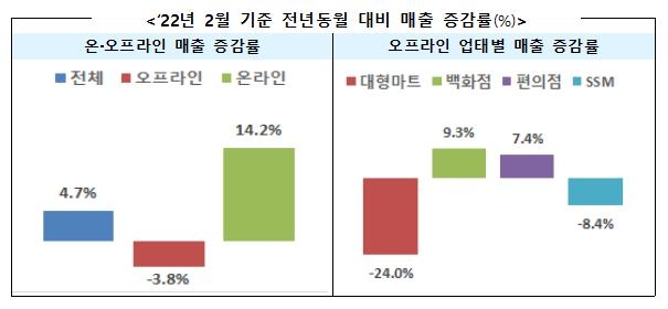 | ▲ 2월 기준 온·오프라인 유통업체 매출 증가율 [산업통상자원부 제공. 재판매 및 DB 금지] |
